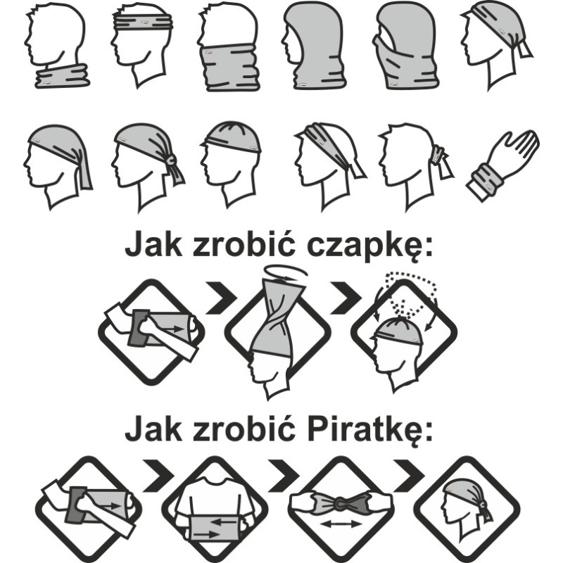 Produkt z całorocznym przeznaczeniem – latem ochroni Cię przed słońcem, zimą przed chłodem. Pakując plecak nie musisz myśleć gdzie upchnąć opaskę, szalik, czapkę, czy kominiarkę. Wystarczy, że zabierzesz ze sobą bandanę. Mnogość rozwiązań pozwoli stworzyć Ci szalik, chustę, piratkę, kominiarkę, maskę, czapkę... Ogranicza nas tylko pomysłowość. Stwórz swój własny wzór lub wybierz go z naszej regularnej oferty.