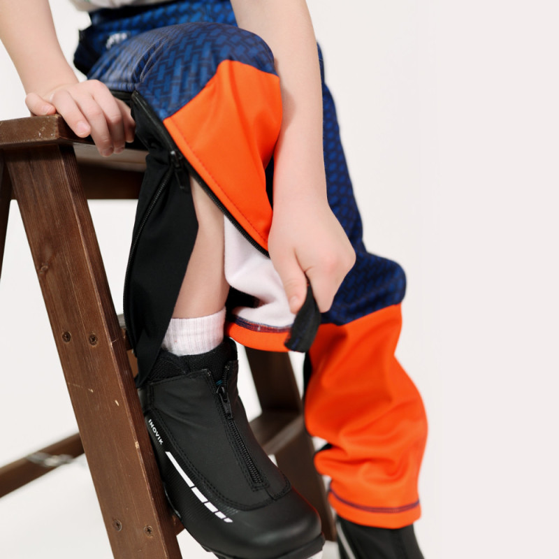 Dziecięce spodnie sportowe wykonane z połączenia materiału softshell z przodu oraz elastycznej dzianiny Super Roubaix z tyłu, przeznaczone do aktywności w chłodniejszych warunkach pogodowych.